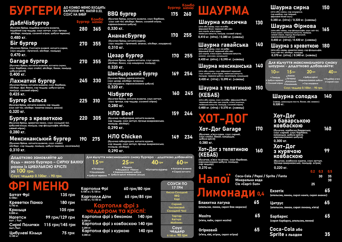 Customer reviews highlight GARAGE's commitment to quality and service. Альона Власюк mentions, “We have ordered multiple times…and always enjoyed the fresh, flavorful dishes.” Alongside the pizzas and burgers, don’t miss their unique offerings like the Garage Box, which includes a pizza, chicken wings, flavorful dips, and refreshing drinks—perfect for sharing or indulging on your own!